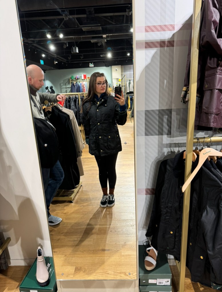 Next, we made a stop at the Barbour store. I’d fallen in love with a jacket at the outlet the day before and wanted to explore more options. (Spoiler: It was the start of my Barbour obsession.)
